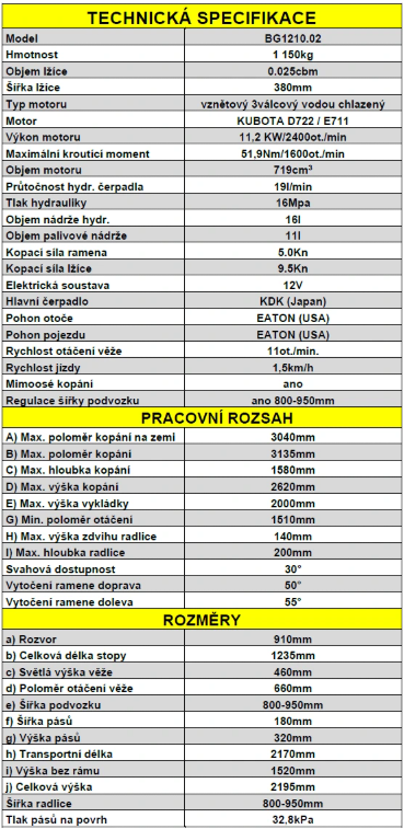 Mini bagre BAUGARDEN BG1210.02 sú konštruované a vyrábané s cieľom garantovať ich spoľahlivosť a dlhú životnosť. Sú vybavené špičkovým, vodou chladeným, 3-valcovým japonským motorom KUBOTA D722/E711 s výkonom 10,2 kW pri 2500 ot./min., ktorý spĺňa najprísnejšie emisné limity normy Euro 5, hlavným čerpadlom s prietokom 19 l/min, chladičom oleja a motormi EATON USA pre pojazd a otoč. Čapy aj oká piestníc sú uložené v púzdrach a mazacie body sú ľahko prístupné.